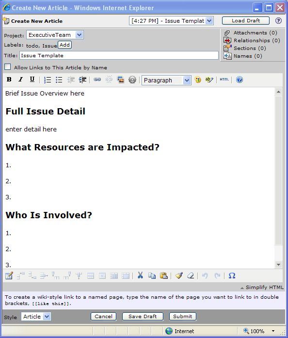 To create an article template in Traction, simply publish an article with the tags, title and body text that you'd like to see others use as a starting point. As needs evolve, this template is easily edited.