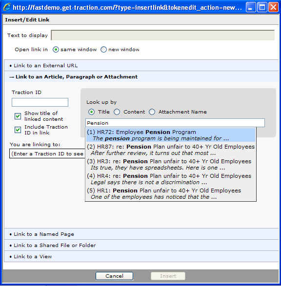 The Employee Pension Program Link is made by linking to an existing Article, Comment or Attachment. In this case, the user starts by typing Pension and gets a set of pages that include the word in their titles. The resulting link can optionally include the Traction ID (in this case HR72). If the user knew ahead of time that the link target was Traction ID HR72, then they could have simply written HR72 into the article text.