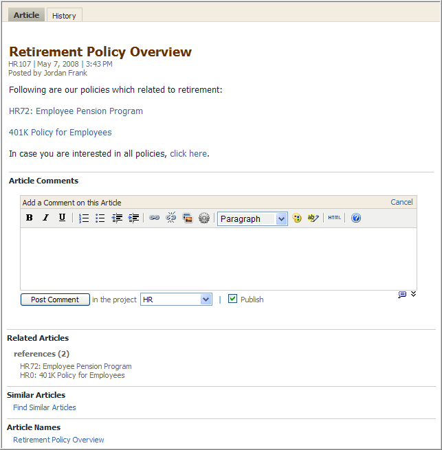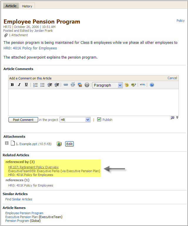 For example if you clicked the Employee Pension Program link shown above you'd see Employee Pension Program article below. Look at the Referenced By list below the Comment form. There's an incoming link from Retirement Policy Overview (the page published in the example above). There's also an incoming link from a page Executive Perks that's posted in the ExecutiveTeam space. If, as a user, you did not have Read permission in the ExecutiveTeam space, the incoming link and the Executive Pension Plan page name wouldn't be shown in the Referenced By list.