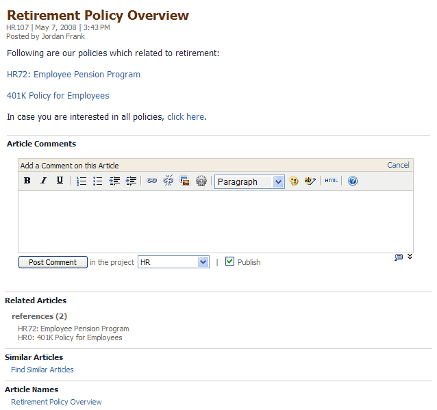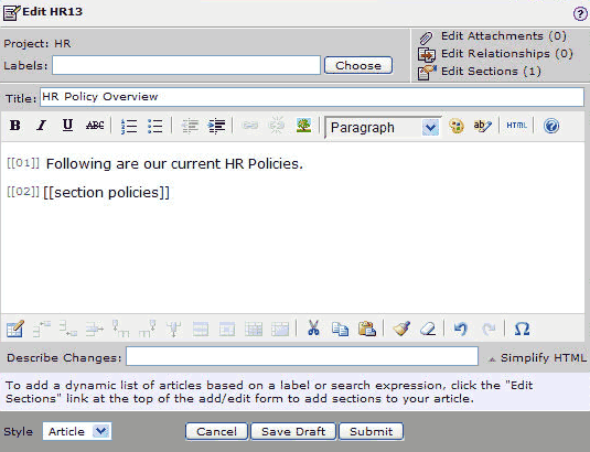You'll notice that an ADD button is included in the section. People with permission to publish in this space can easily add to the section simply by filling in the New Article form that pops up. This makes it easy to encourage a specified type of contribution. With a simple section setting, you can configure the ADD button to launch a Article Templates or even custom forms.