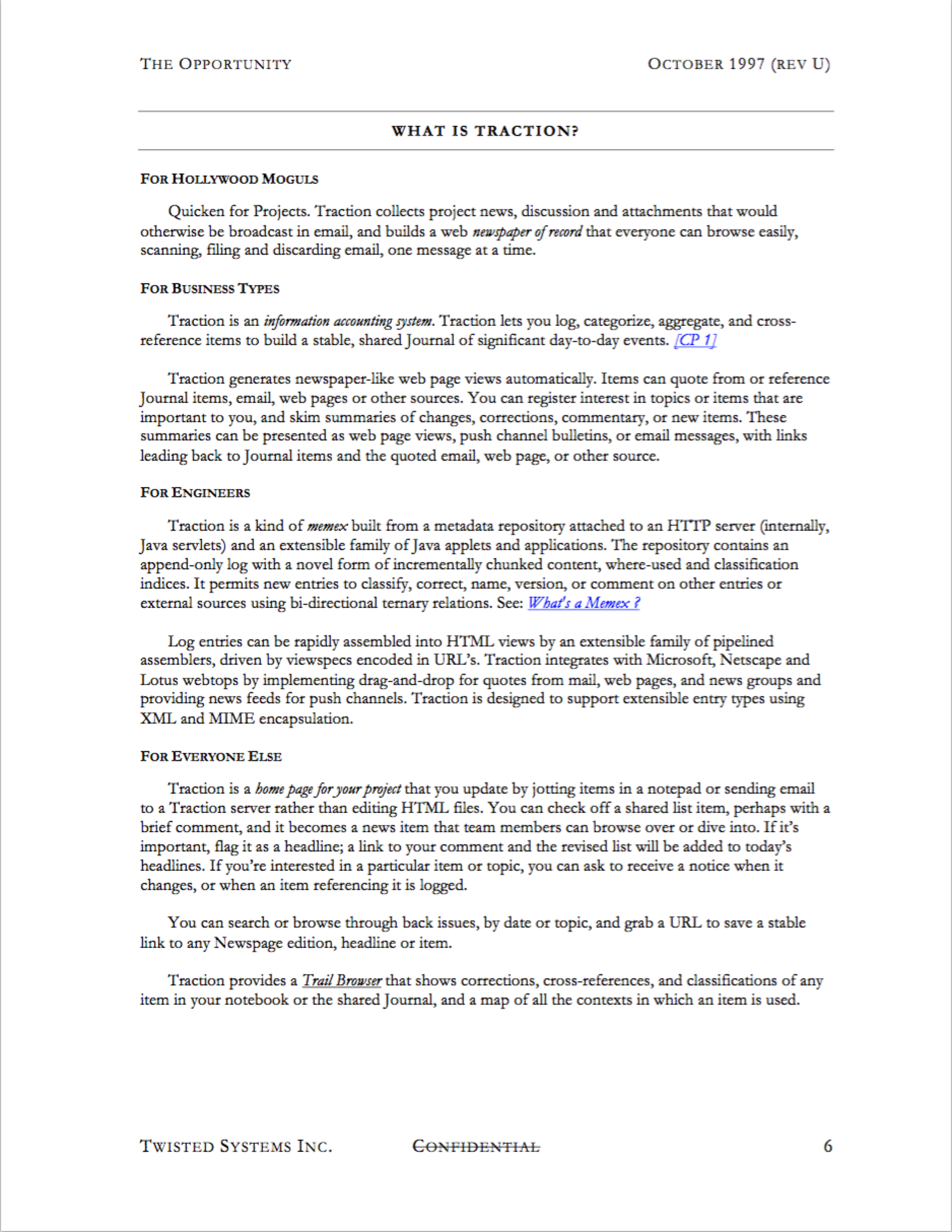 Motivated by Chris Nuzum's recent Tripping Up Memory Lane talk at HyperKult 2015, and Takashi Okutsu's Design Concepts followup, I'm happy to continue the Traction history theme. I've removed the Confidential markings from the Proposal, and released it under the Creative Commons Attribution-Non-Commercial license (CC BY-NC 4.0), so you're welcome to read and use it for non-commercial purposes with attribution. Please link directly to this blog post.