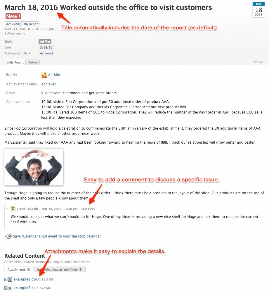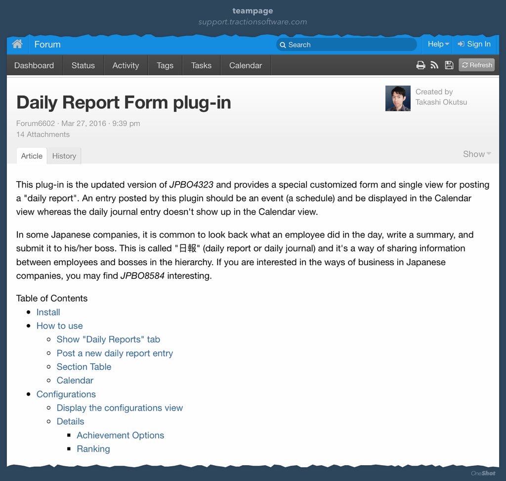 Takashi's plug-in adds a Daily Report form to post and edit daily reports, along with a Daily Reports tab that includes a feed view, summary table, calendar view, and optional ranking. In addition to making it simple for employees to post a daily report, each report can be discussed, emailed, searched, and used like any other TeamPage article. For example, a visit to a customer which includes a suggestion or identifies a problem can be tagged with a follow-up task pinned to the original report and person who reported it, easily tracked from start to finish.