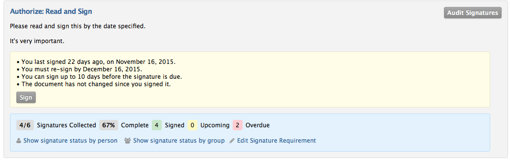 You can schedule signature requirements to be completed by a specific date, and you can also set them to recur automatically, for example to help clinical staff fulfill the requirement to review certain Standard Operating Procedures on an annual basis.