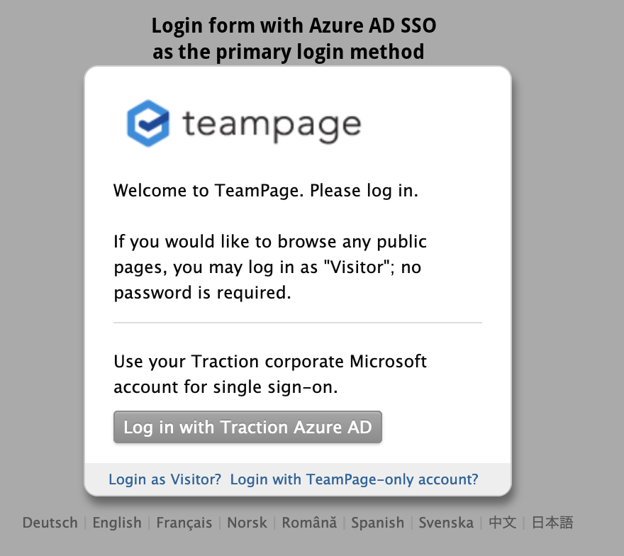 Easily customize the appearance of the login form: designate whether Azure AD SSO is the primary, secondary or sole login method; and supply your preferred text for the SSO login prompt and button label. In the example below, Traction Azure AD is the primary login method and anyone with a corporate account managed by Traction Software's Azure AD tenant can log without having to create a separately managed TeamPage account. You can also optionally continue to create or maintain TeamPage accounts not connected to Microsoft accounts.