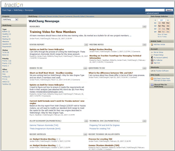 First, they bring important time ordered (Status Reports, Meeting Notes, Issues and Questions) and wiki type content (Alloy Glossary and Tech Doc) to the foreground.