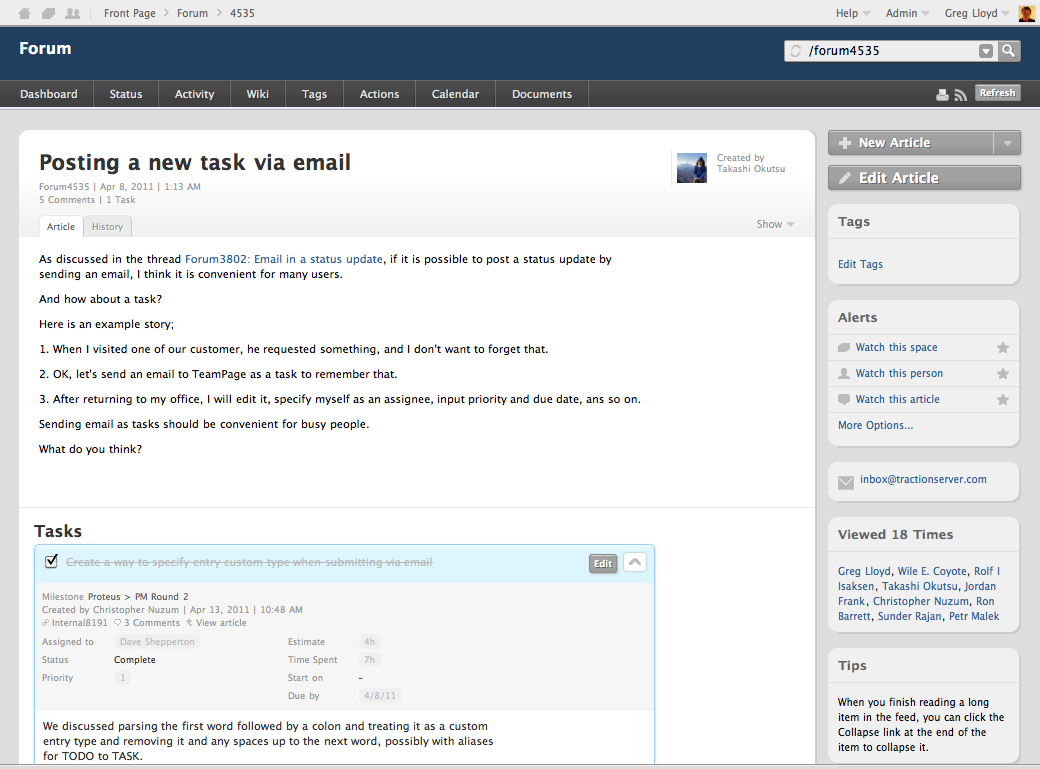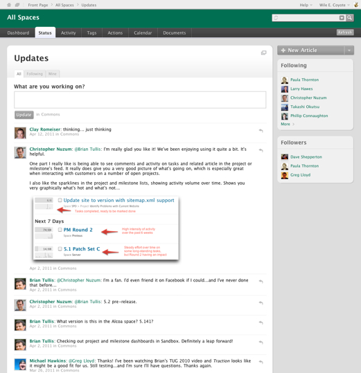 "There's been a lot of Web and Twitter discussion about the value of activity streams to promote broad awareness versus the potential problem of showing too much information and having important signals get lost in the flow ," said Greg Lloyd, President and co-founder of Traction Software Inc. "Traction TeamPage makes it simple to zoom into activity streams, status and discussions - by space, by project, person or milestone - when you want to focus. You can register for automatic email or Jabber notification when anything is added, changed, or discussed in a context you want to watch carefully."